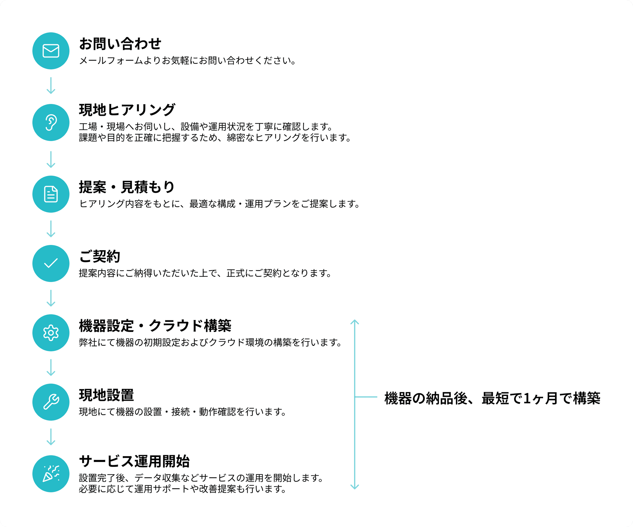 ご契約手続き完了から概ね1か月前後で可視化画面の設定までを行います。PLCやセンサーなどの台数や可視化画面の